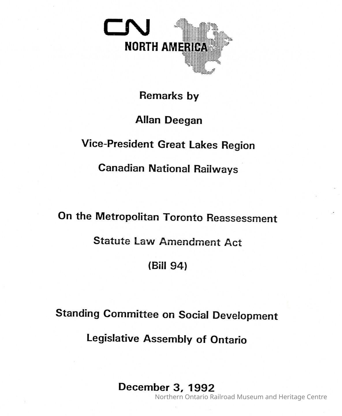 Document, Remarks by Allan Deegan, Vice President Great Lakes Region, Canadian National Railways, on the Metropolitan Toronto Reassessment Statute Law Amendment Act, Bill 94, Standing Committee on Social Development, Legislative Assembly of Ontario.Collection