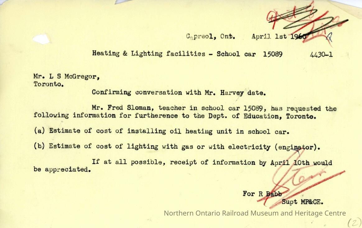 Document, School Car 15089, Estimate of cost for oil heating, gas, and electricity, R. Babb, April 1st 1960.Collection