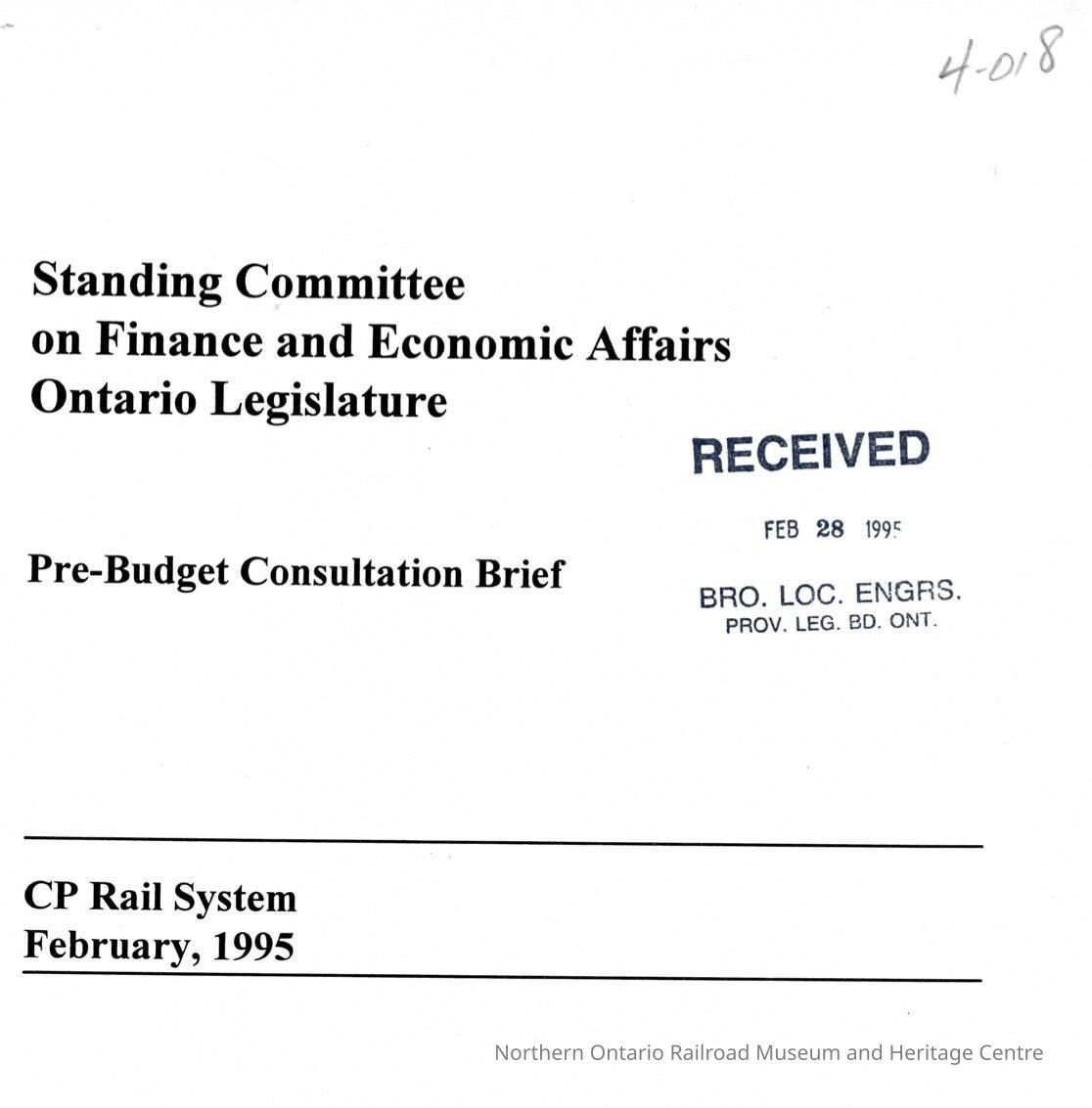 Document, Standing Committee on Finance and Economic Affairs Ontario Legislature, Pre-Budget Consultation Brief, CP Rail System, February 1995.Collection