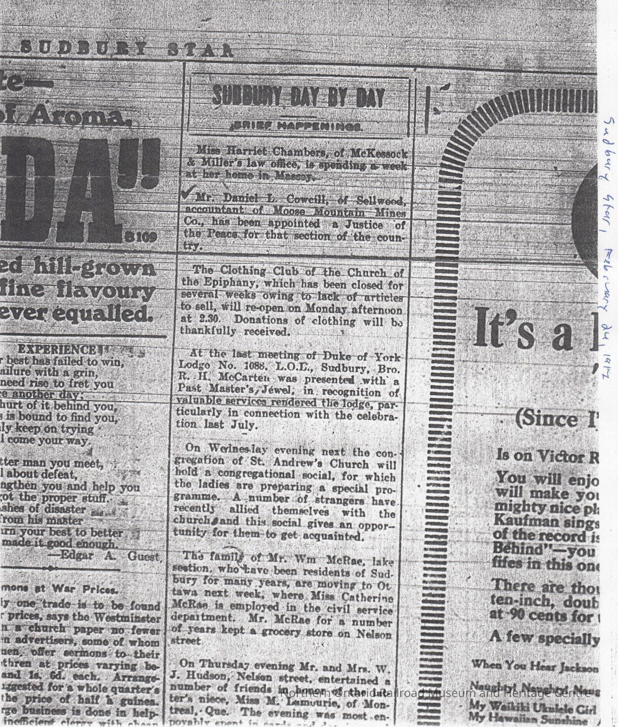 A series of brief news articles of events in Sudbury, including the closing of the Clothing Club of the Church of the Epiphany, and the presentation of a Past Master's Jewel to R. H. McCarter by the Duke of York Lodge.