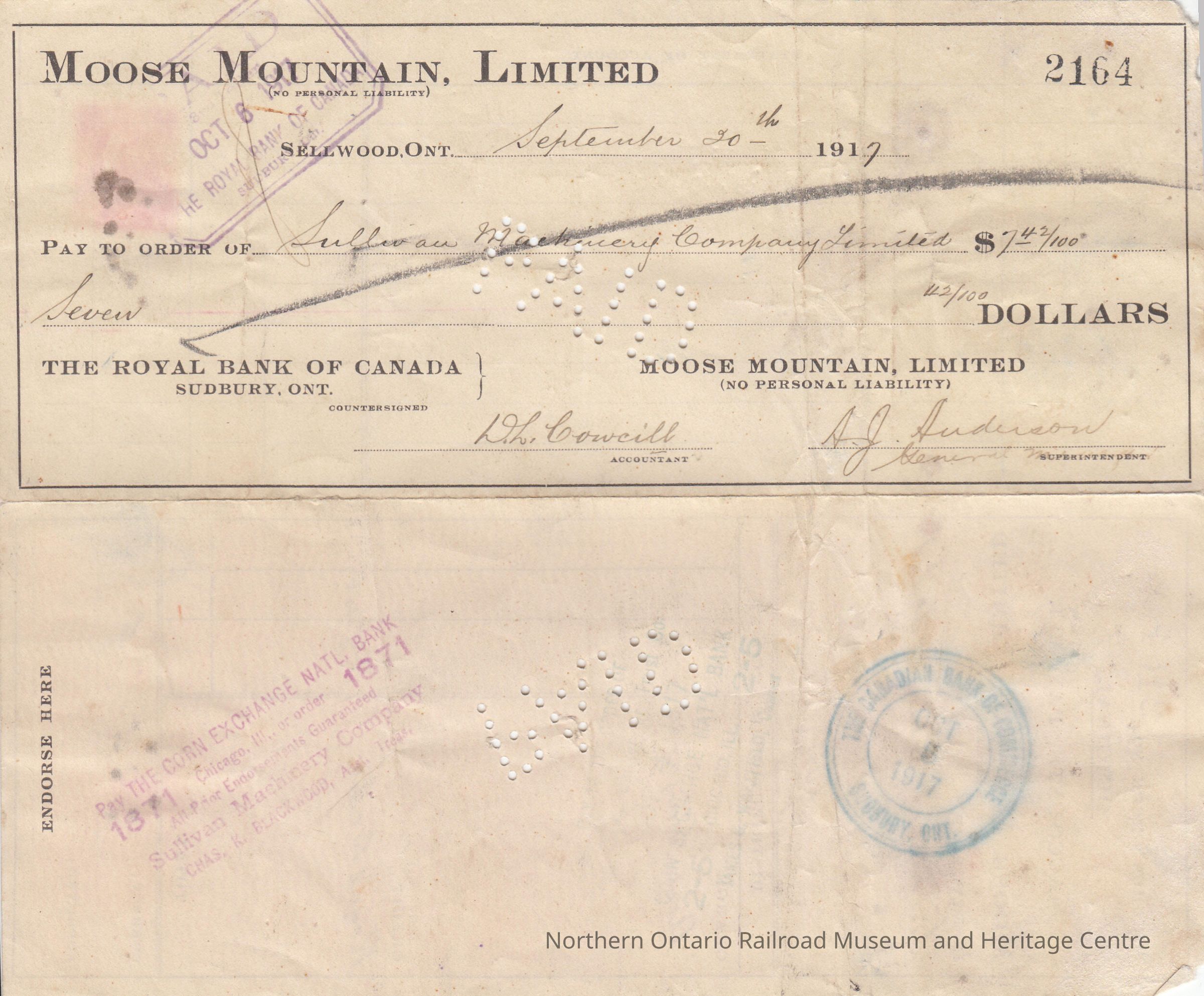 A cheque to Sullivan Machinery Company Ltd from Moose Mountain Limited in the amount of $7.42. From the R. Bozinet family.Notes