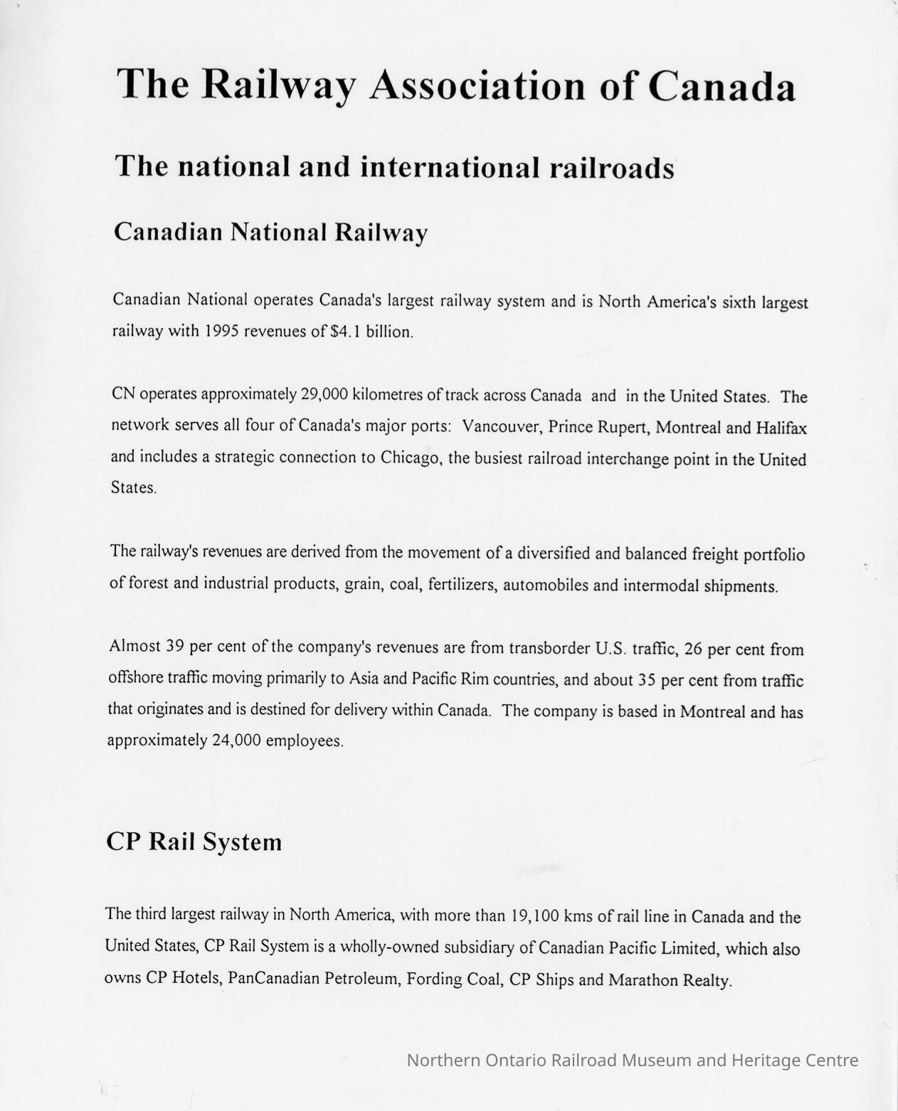 Document, The Railway Association of Canada, the National and International Railroads, History.Collection