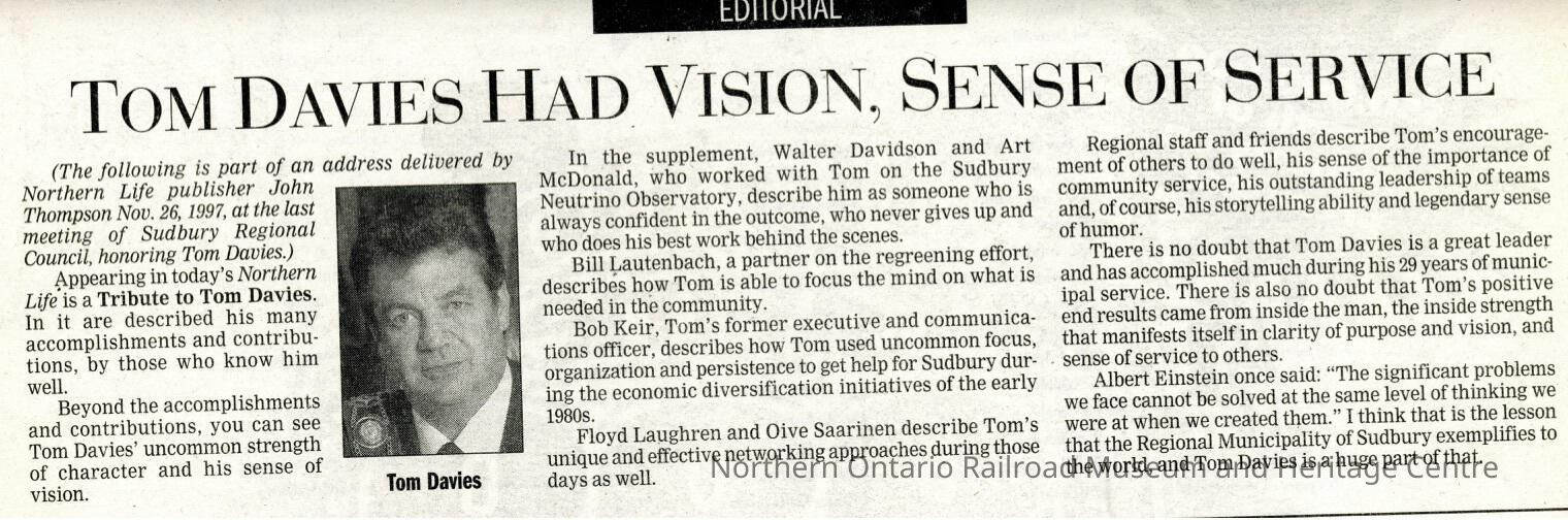 Document, Tom Davies Had Vision, Sense Of Service.Collection