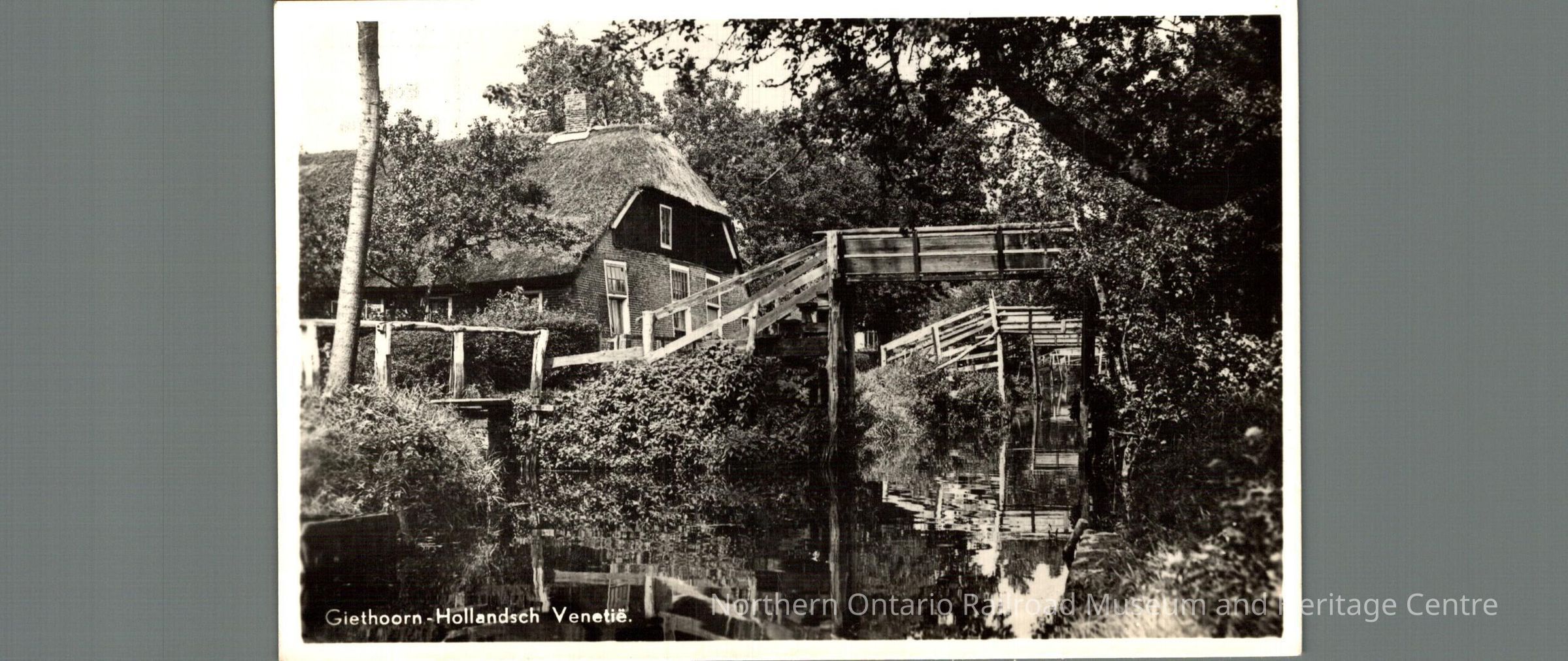 Blank postcard with "1943" written in pencil on the back. Front image is of a house with a bridge captioned "Giethoor-Hollandsch Venetie"Context