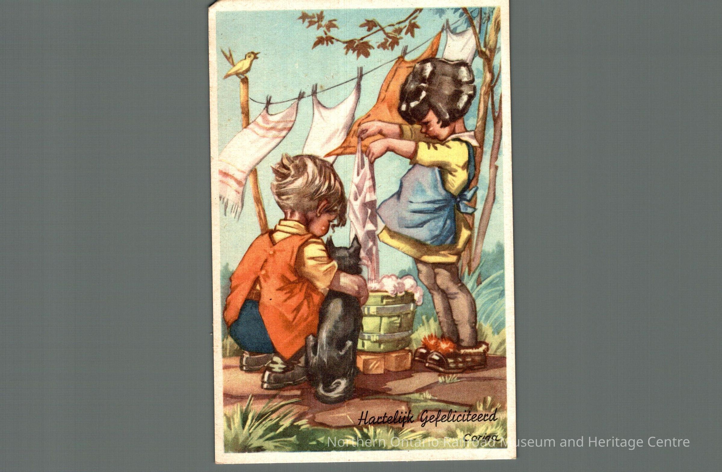 Postcard, not addressed with a message written in Dutch, front image is of children hanging laundry with the caption "Hartelijk Gefeliciteerd"Context