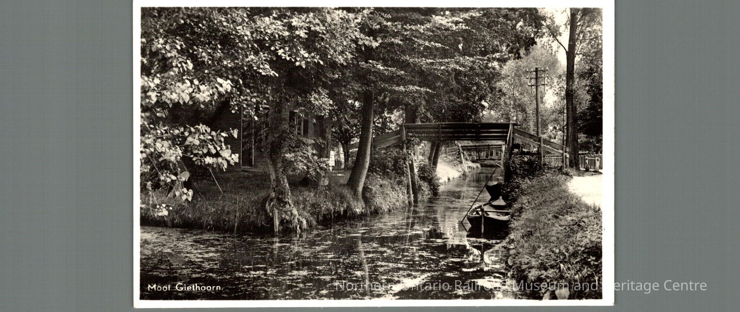 Blank Dutch postcard with "1943" written in pencil on the back, front image is of a bridge captioned "Mooi Giethoorn"Context