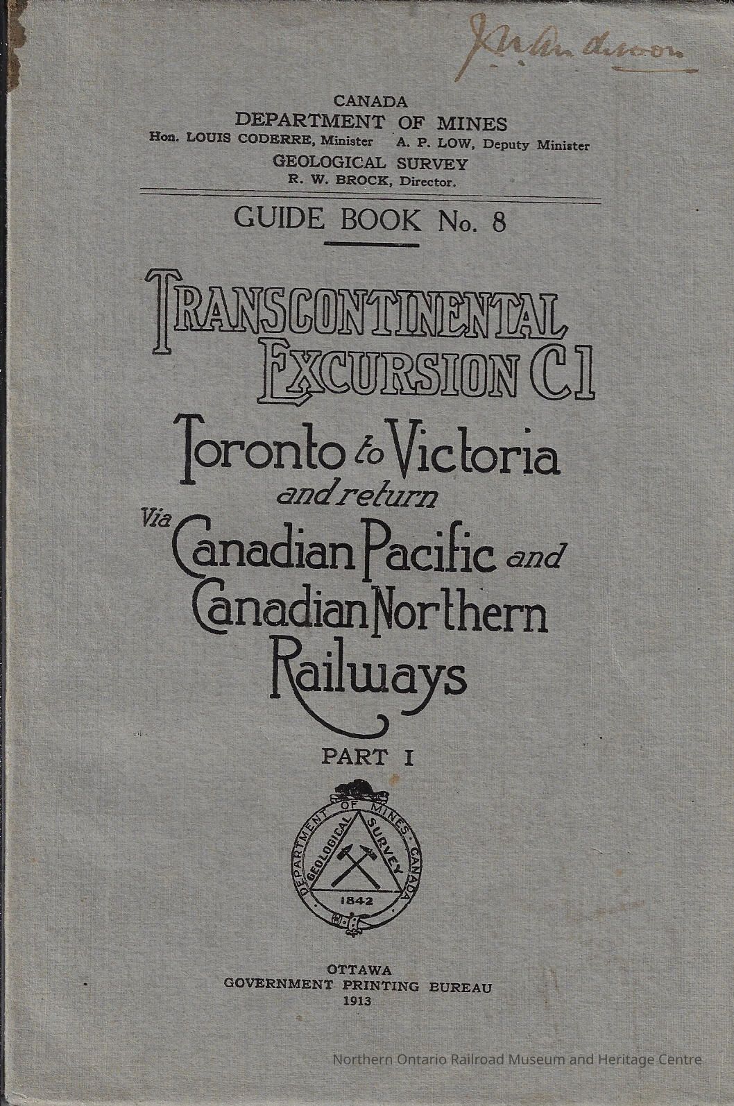 Book, guidebook #8 published by the Canada Department of Mines, Geological Survey, for Transcontinental Excursion C1, from Toronto, Ontario to Victoria, British Columbia and back, via both the Canadian Pacific and Canadian Northern Railways.Context