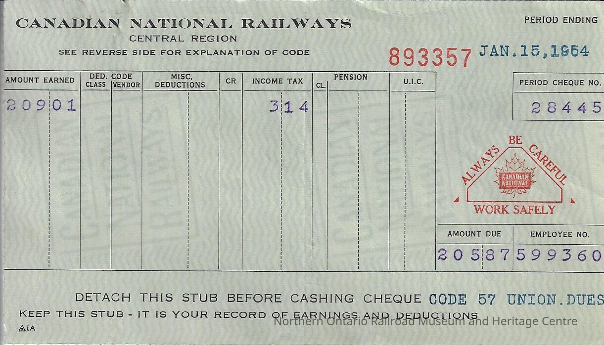 Canadian National branded statement of earnings and deductions belonging to Frank Mazzuca for the pay period ending on January 15, 1954Creator