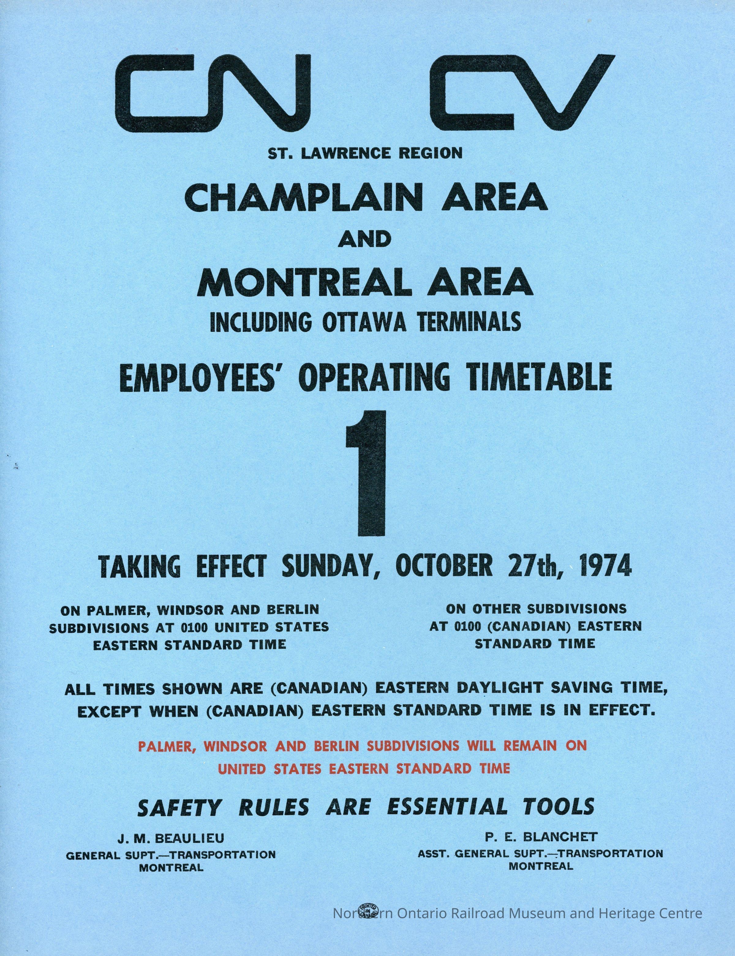 Employee Timetable, CN-CV, St. Lawrence Region, Champlain Area, Montreal Area, Ottawa Terminals, Timetable 1, October 27th 1974Collection