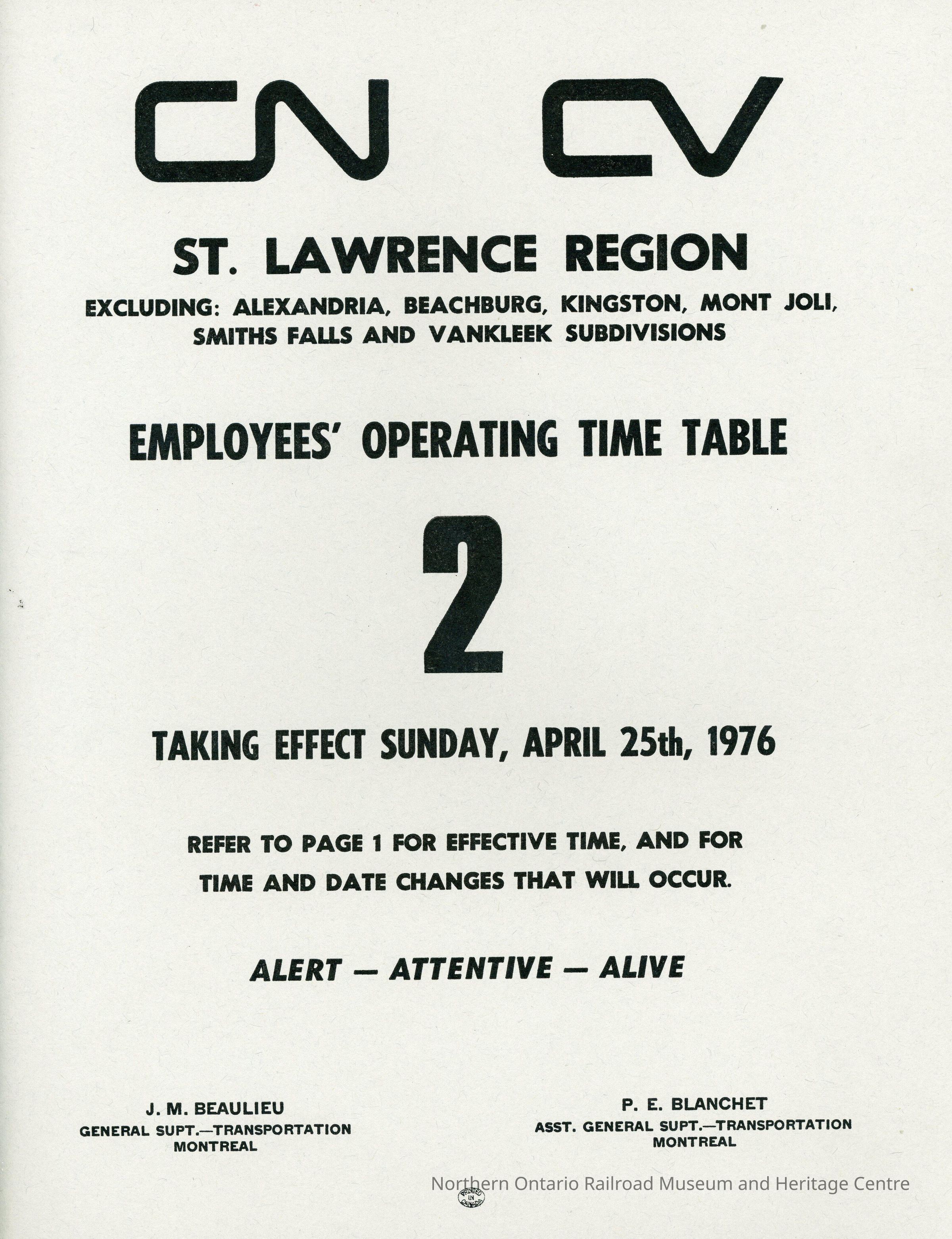 Employee Timetable, CN-CV, St. Lawrence Region, Timetable 2, April 25th 1976.Collection