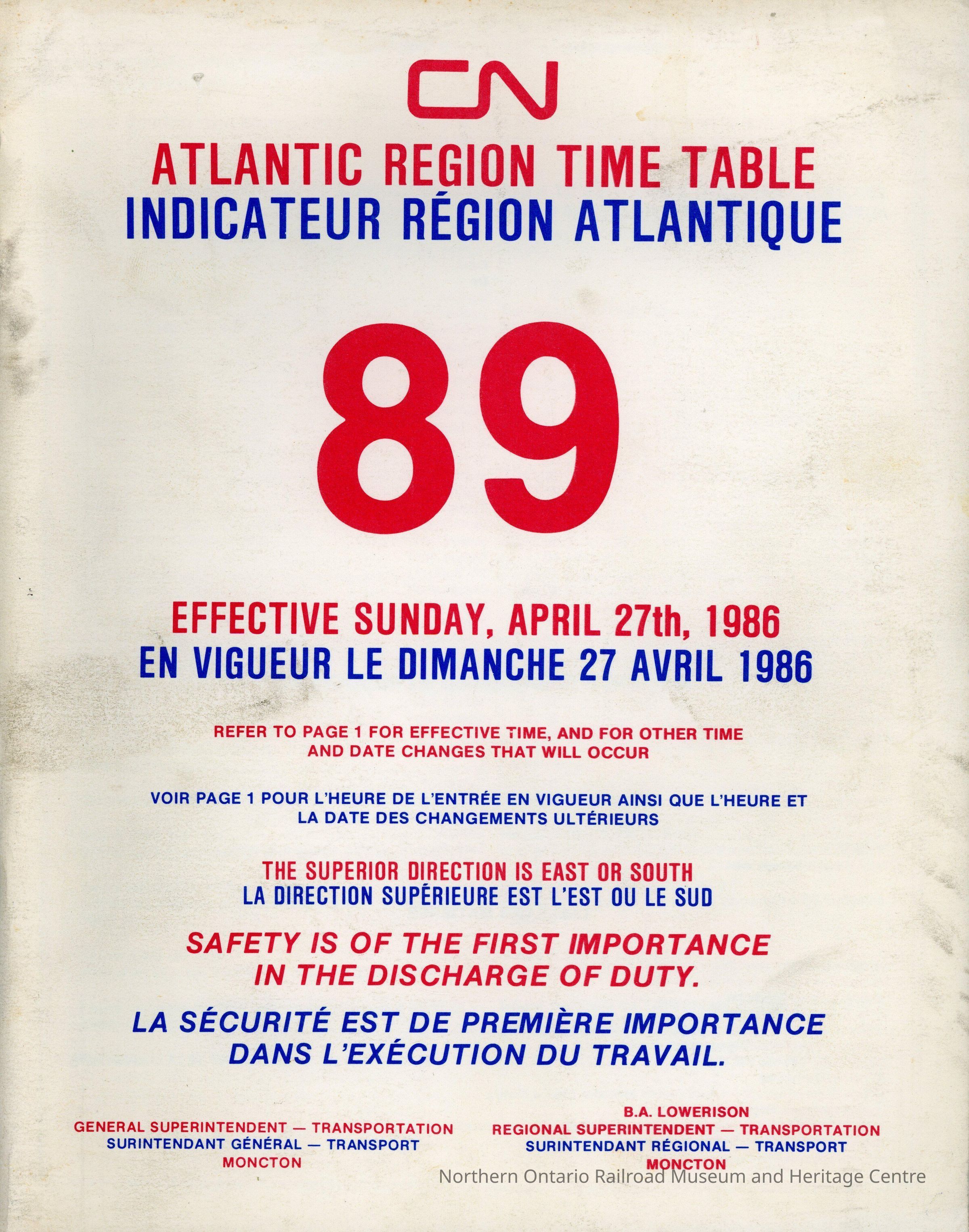 Employee Timetable, CN Rail, Atlantic Region 89, April 27th 1986.Collection