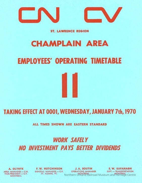 Employee Timetable, CN Rail, Champlain Area 11, January 7th 1970.Collection