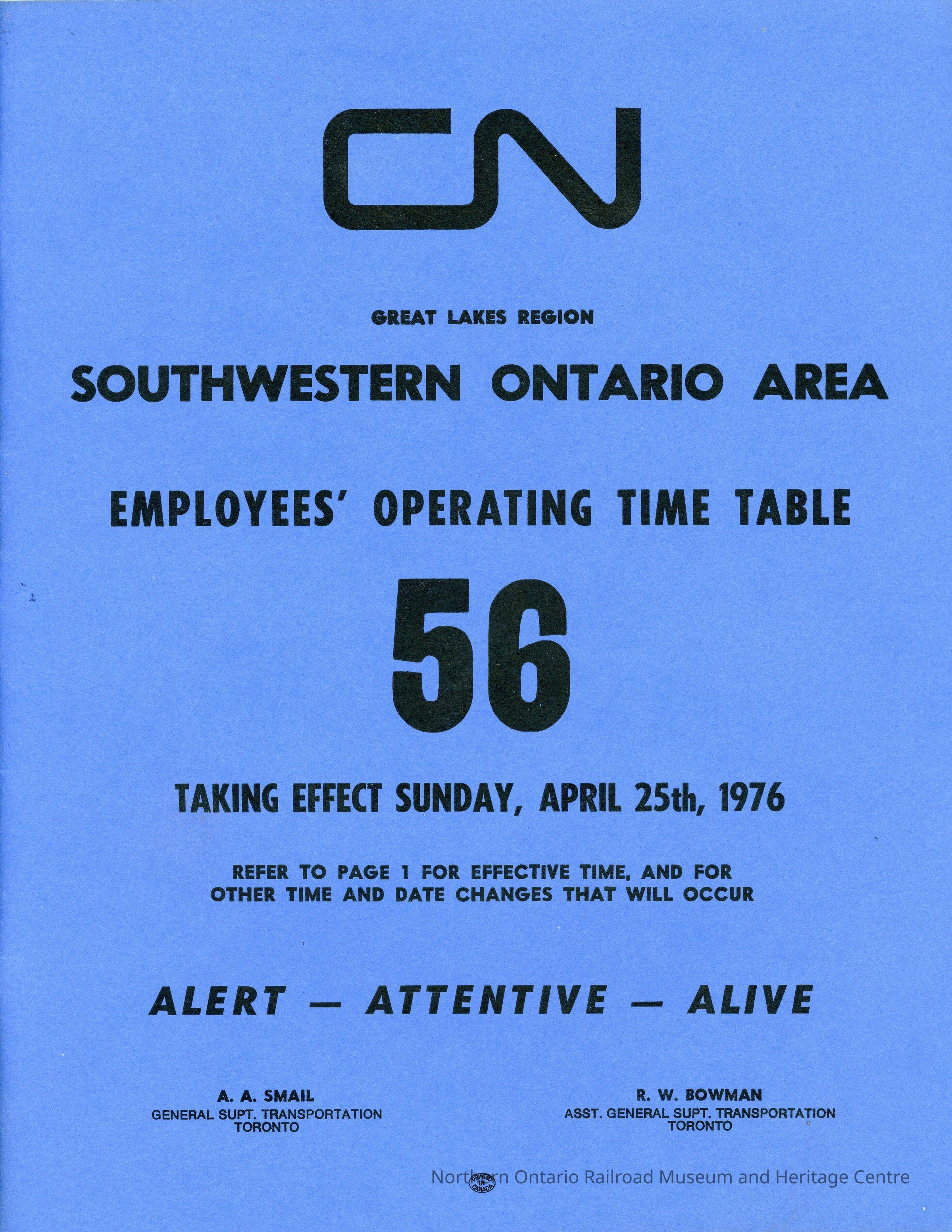 Employee Timetable, CN Rail, Great Lakes Region, Southwestern Ontario Area, Timetable 56, April 25th 1976.Collection