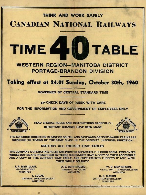 Employee Timetable, CN Rail, Manitoba District 40, October 30th 1960.Collection