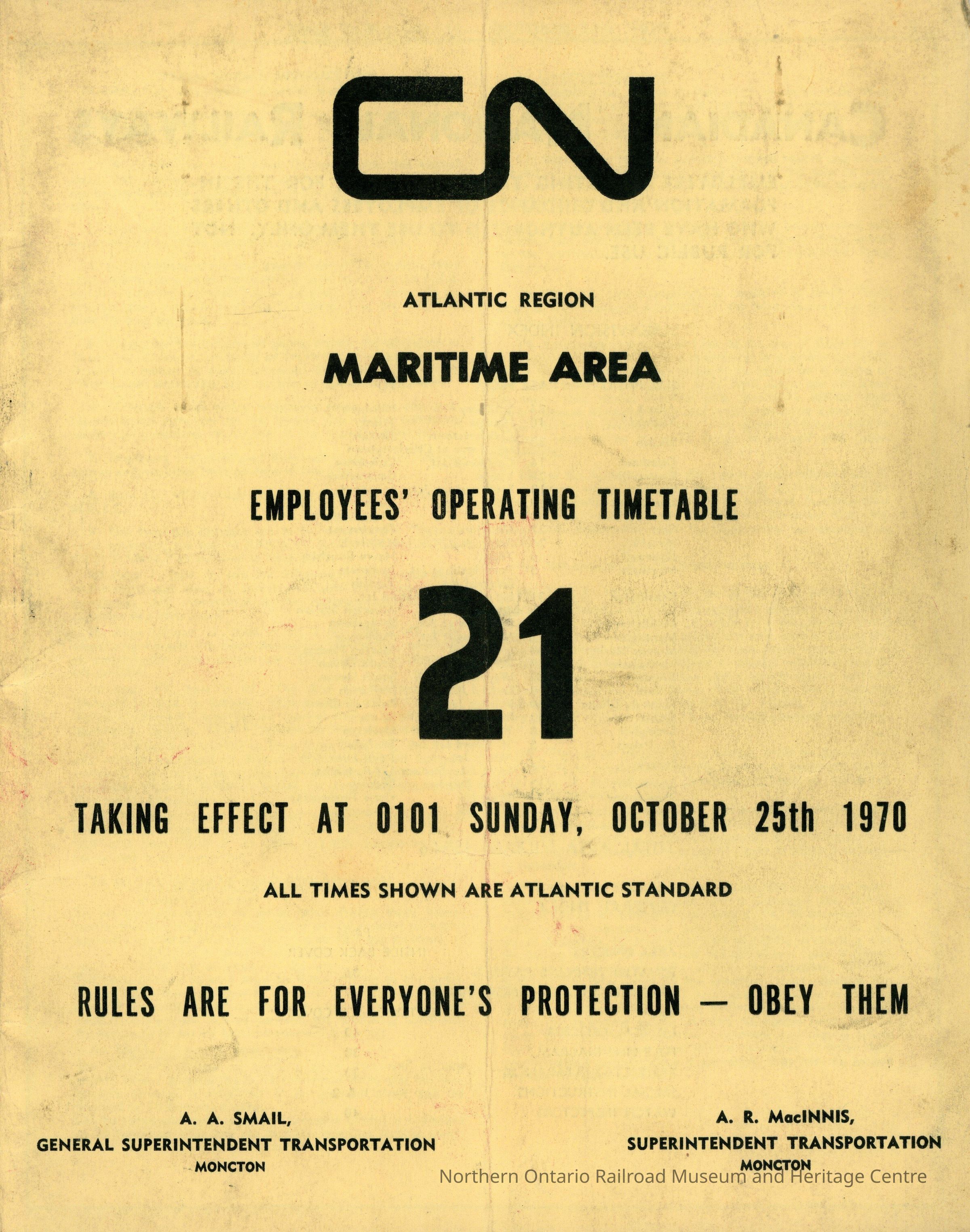 Employee Timetable, CN Rail, Maritime Area 21, October 25th 1970.Collection