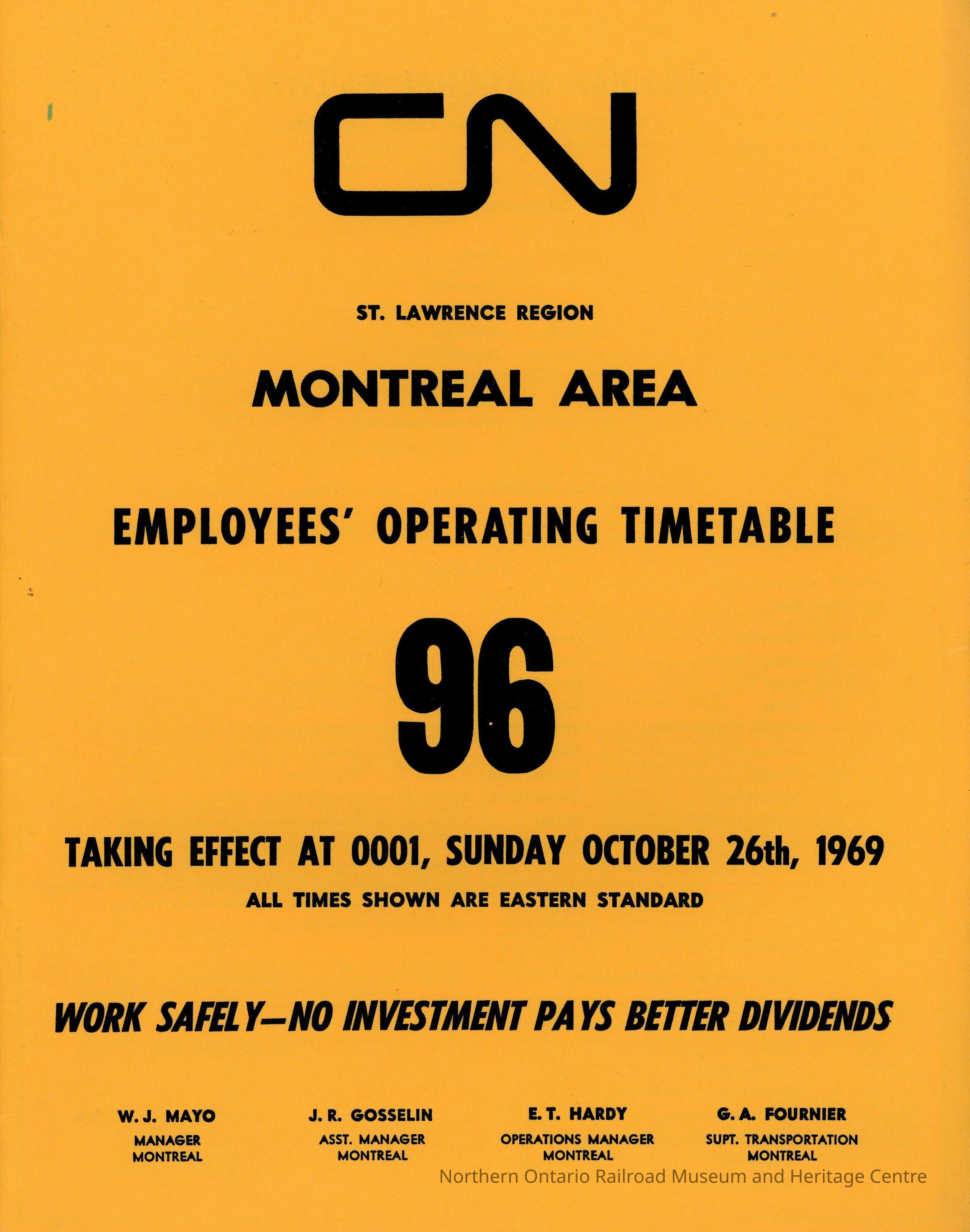 Employee Timetable, CN Rail, Montreal Area 96, October 26th 1969.Collection