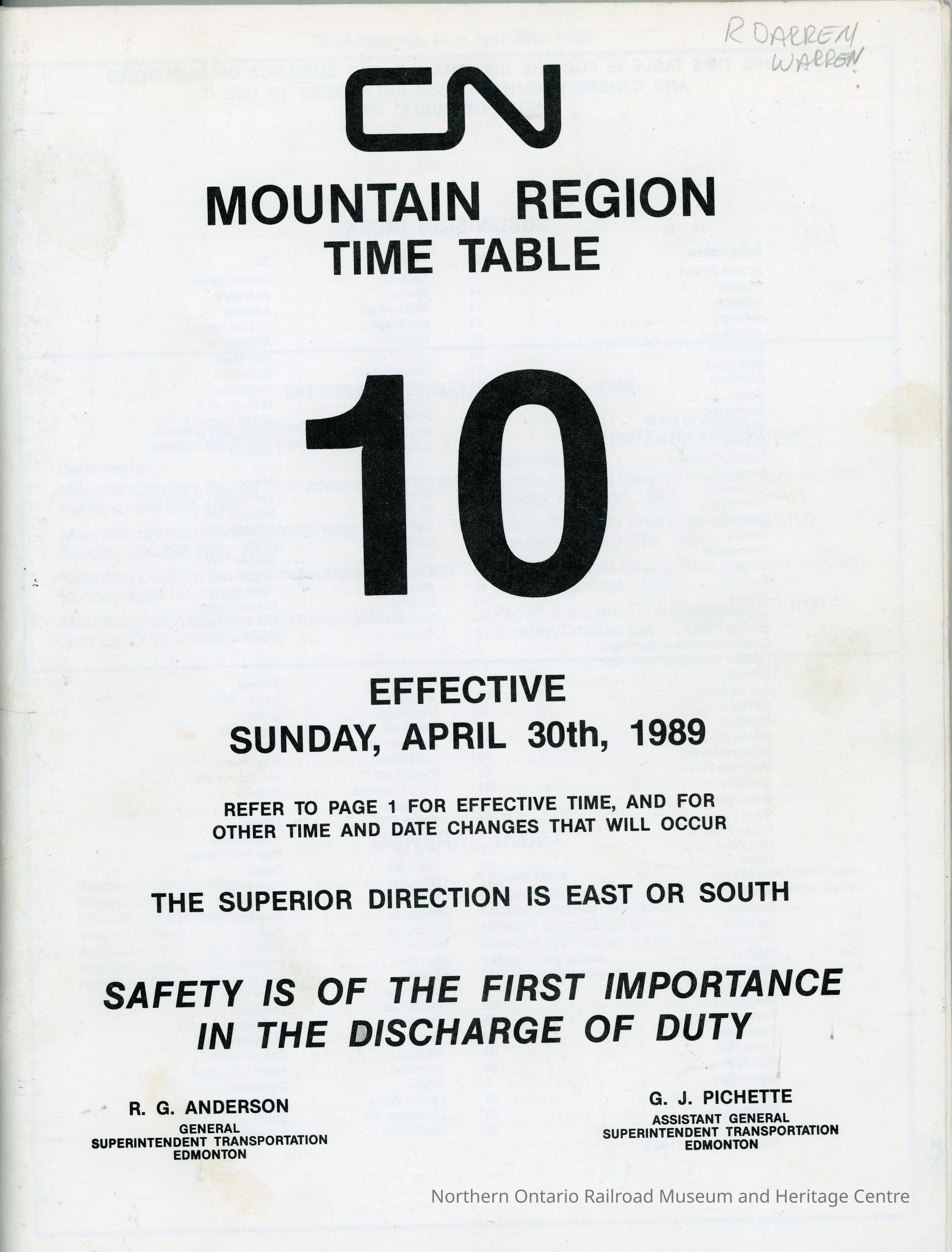 Employee Timetable, CN Rail, Mountain Region 10, April 30th 1989.Collection