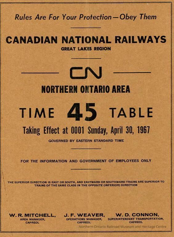 Employee Timetable, CN Rail, Northern Ontario Area 45, April 30th 1967.Collection