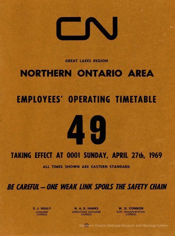 Employee Timetable, CN Rail, Northern Ontario Area 49, April 27th 1969.Collection
