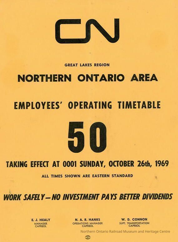 Employee Timetable, CN Rail, Northern Ontario Area 50, October 26th 1969.Collection