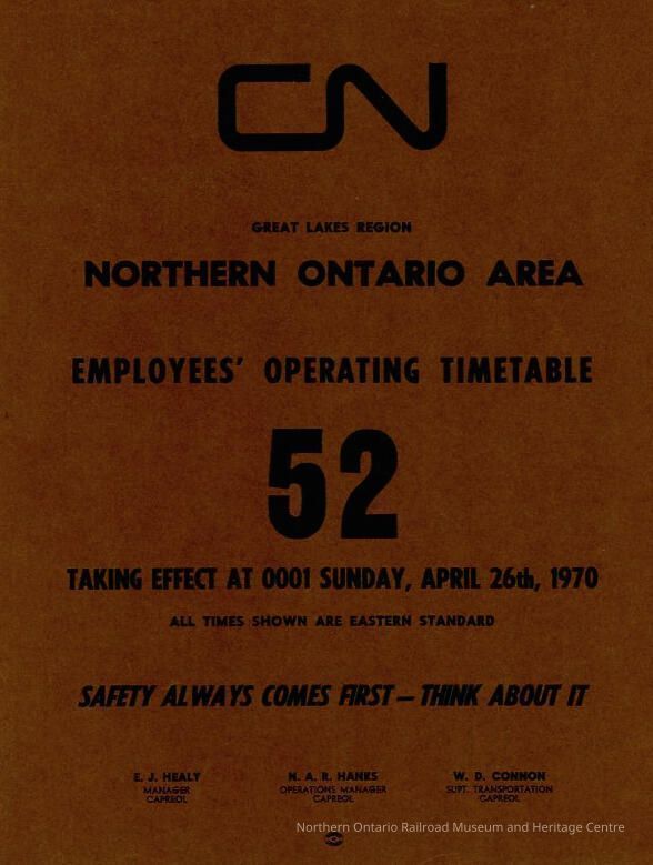 Employee Timetable, CN Rail, Northern Ontario Area 52, April 26th 1970.Collection