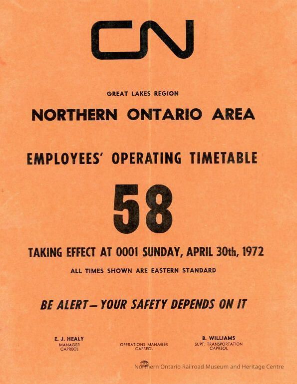 Employee Timetable, CN Rail, Northern Ontario Area 58, April 30th 1972.Collection