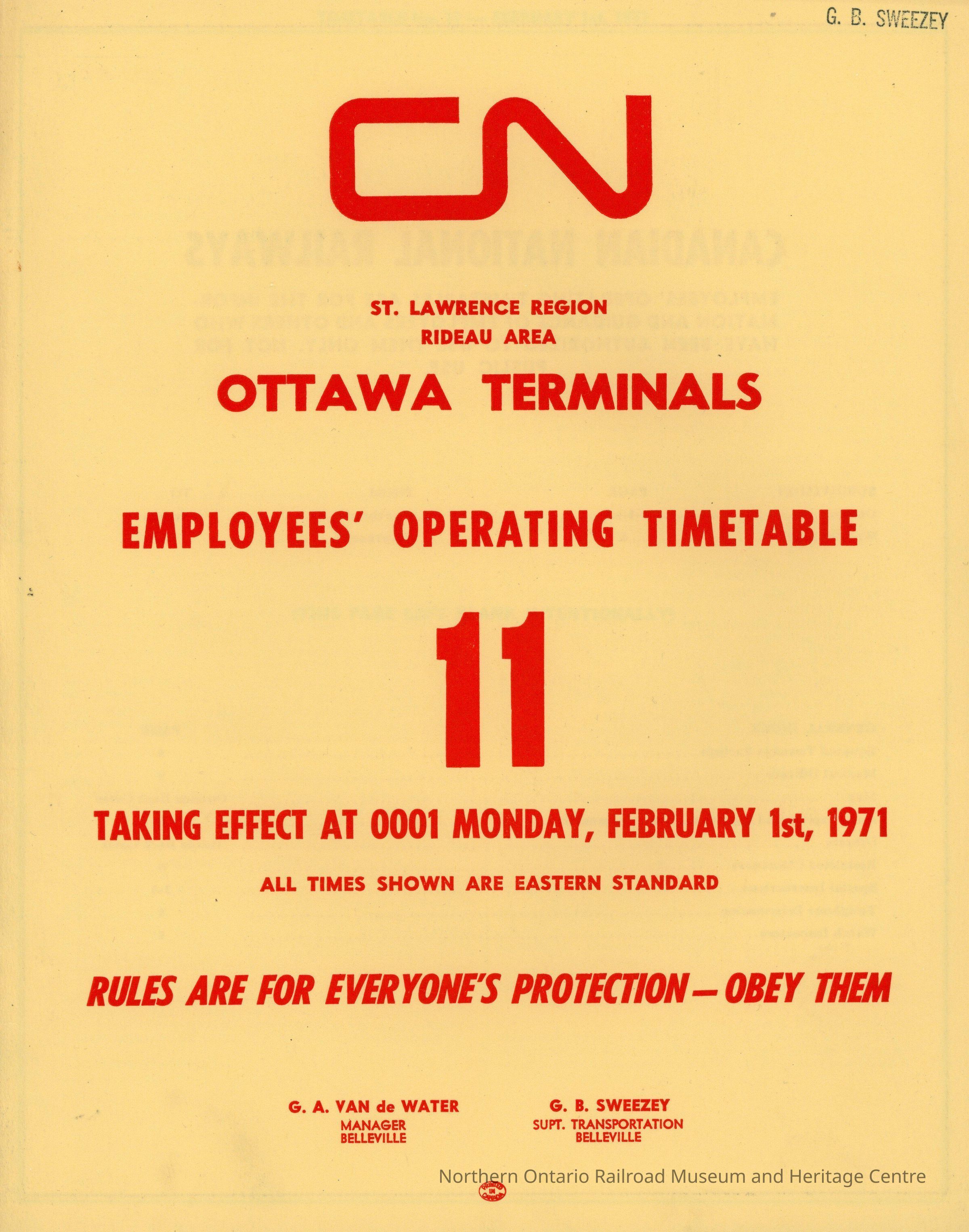 Employee Timetable, CN Rail, Ottawa Terminals 11, February 1st 1971.Collection