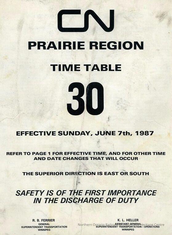 Employee Timetable, CN Rail, Prairie Region 30, June 7th 1987.Collection