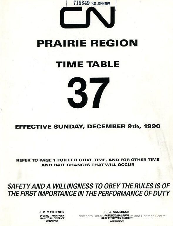 Employee Timetable, CN Rail, Prairie Region 37, December 9th 1990.Collection