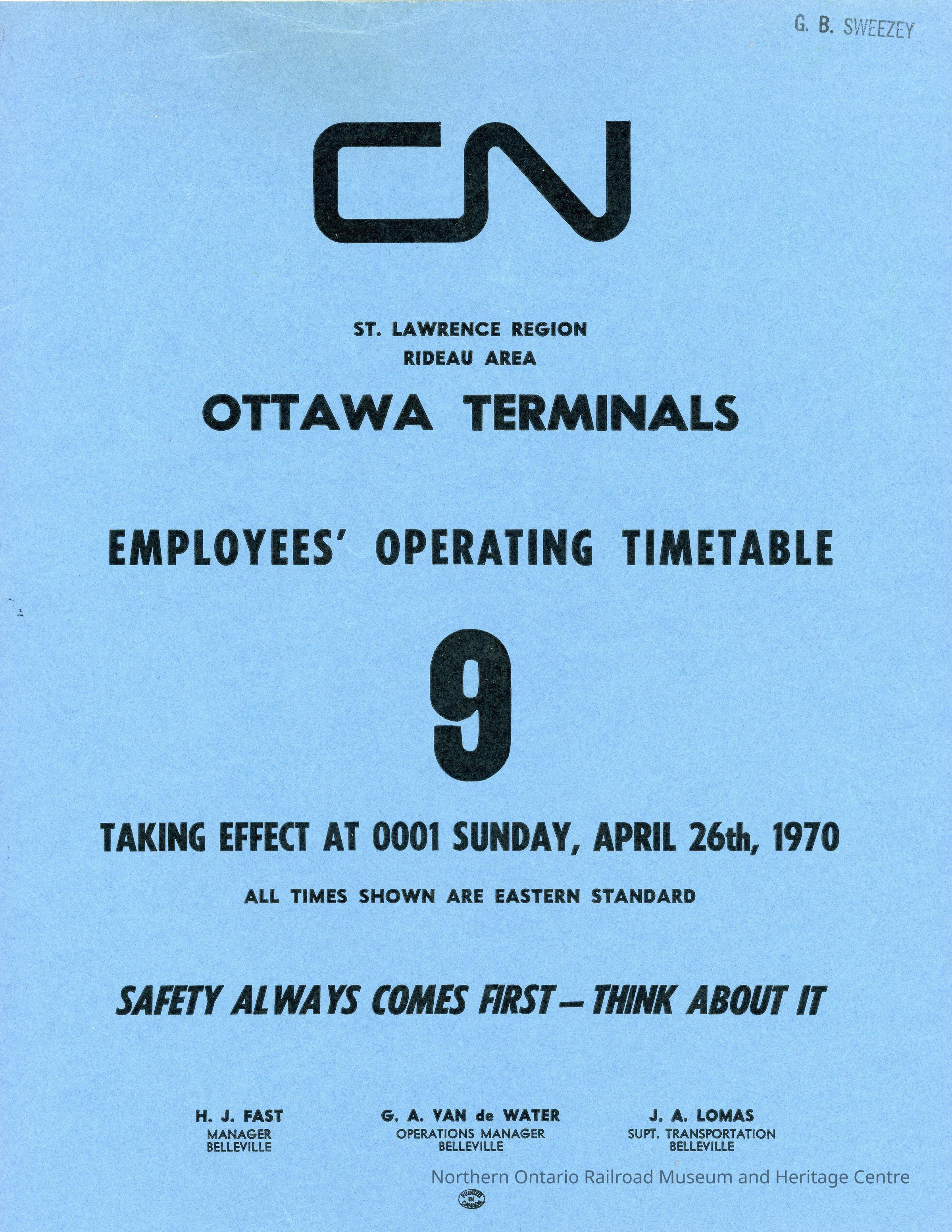 Employee Timetable, CN Rail, Rideau Area, Ottawa Terminals, Timetable 9, April 26th, 1970.Collection