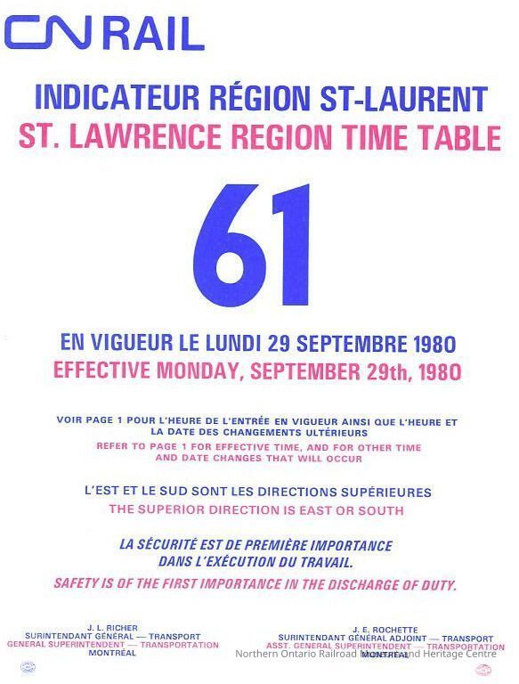 Employee Timetable, CN Rail, St. Lawrence Region 61, September 29th 1980.Collection