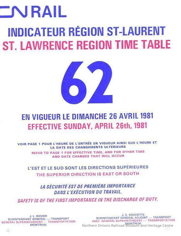 Employee Timetable, CN Rail, St. Lawrence Region 62, April 26th 1981.Collection