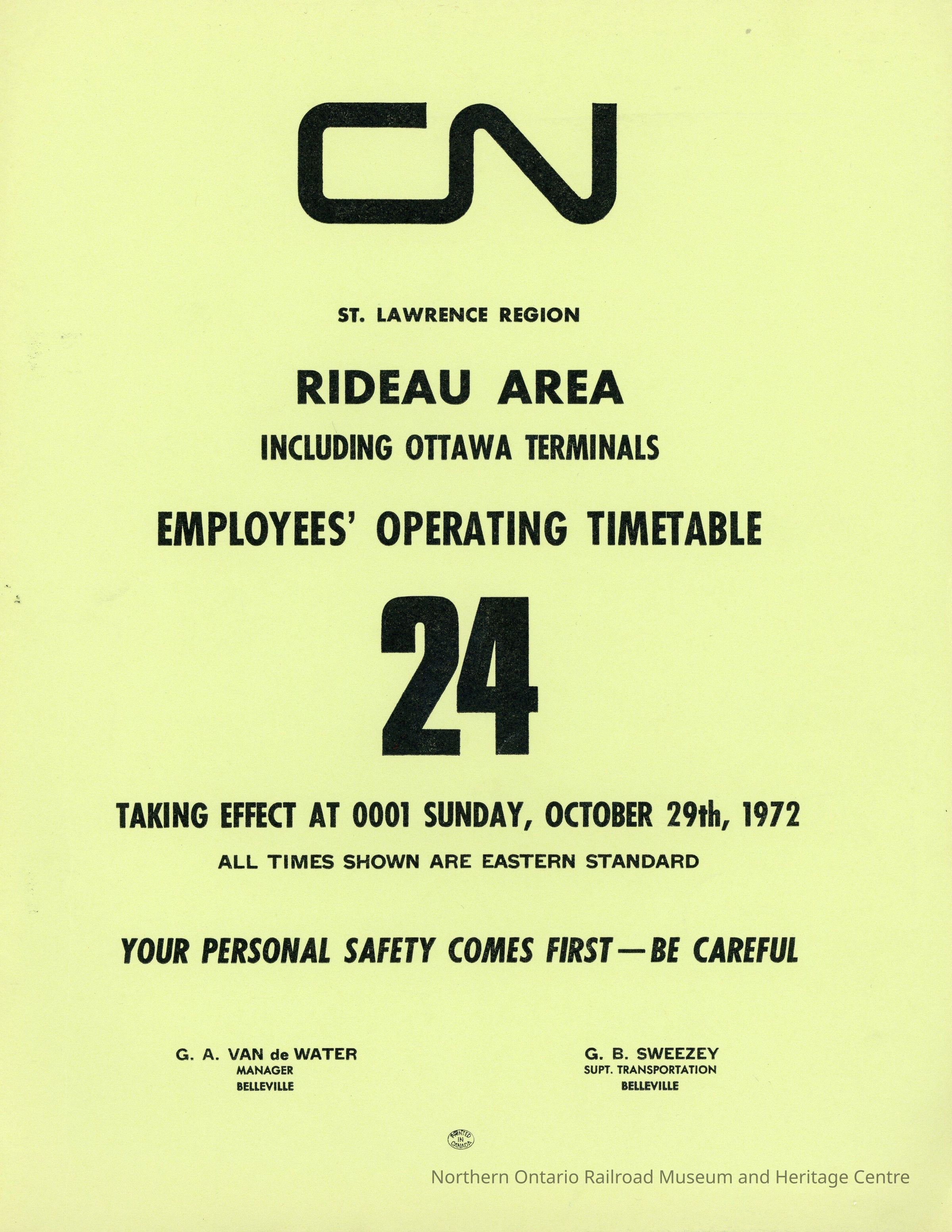 Employee Timetable, CN Rail, St. Lawrence Region, Rideau Area Including Ottawa Terminals, Time Table 24, October 29th 1972.Collection