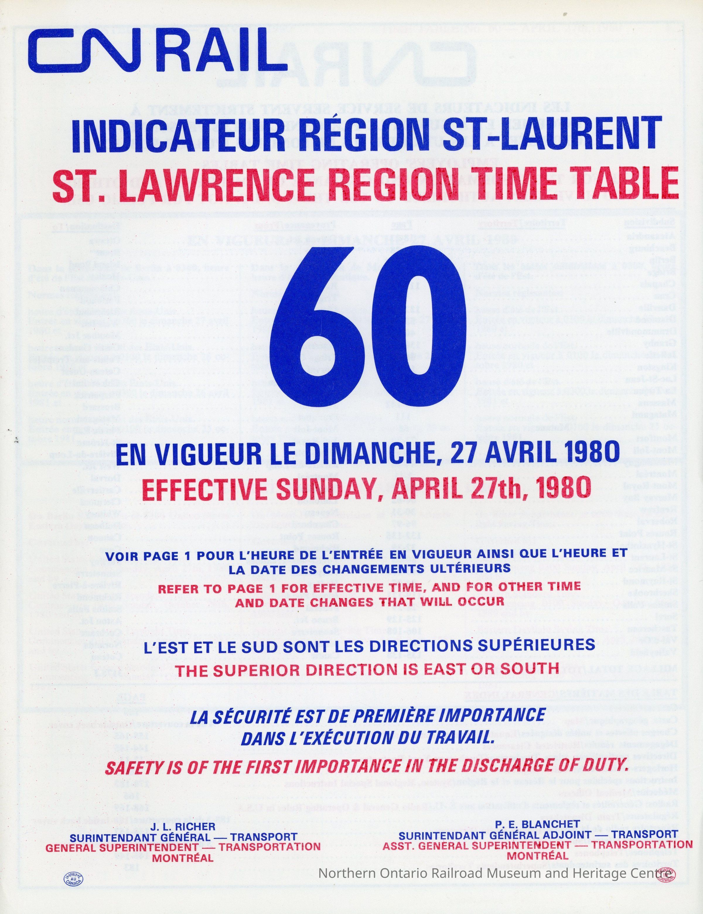 Employee Timetable, CN Rail, St. Lawrence Region Time Table 60, April 27th 1980.Collection