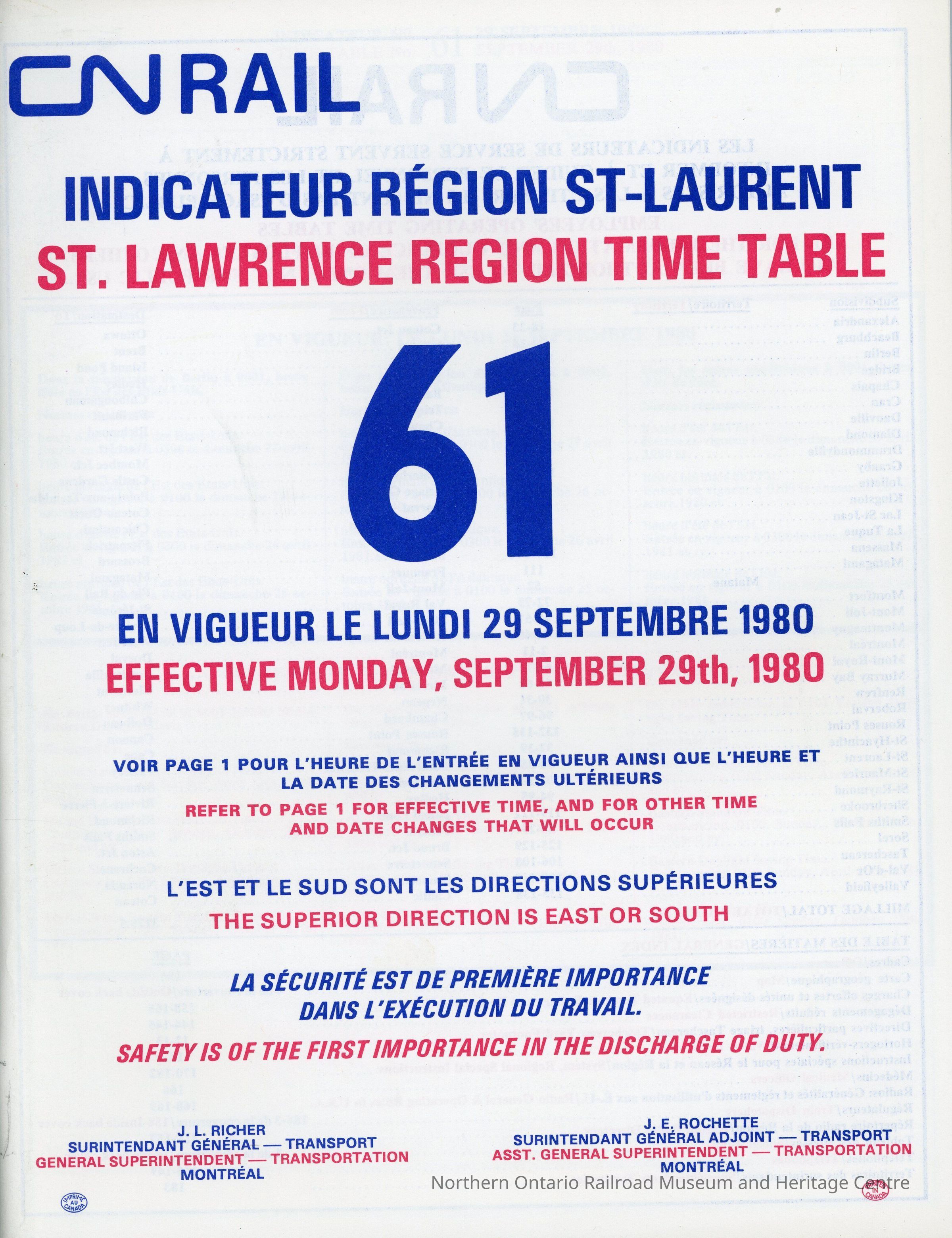 Employee Timetable, CN Rail, St. Lawrence Region Time Table 61, September 29th 1980Collection