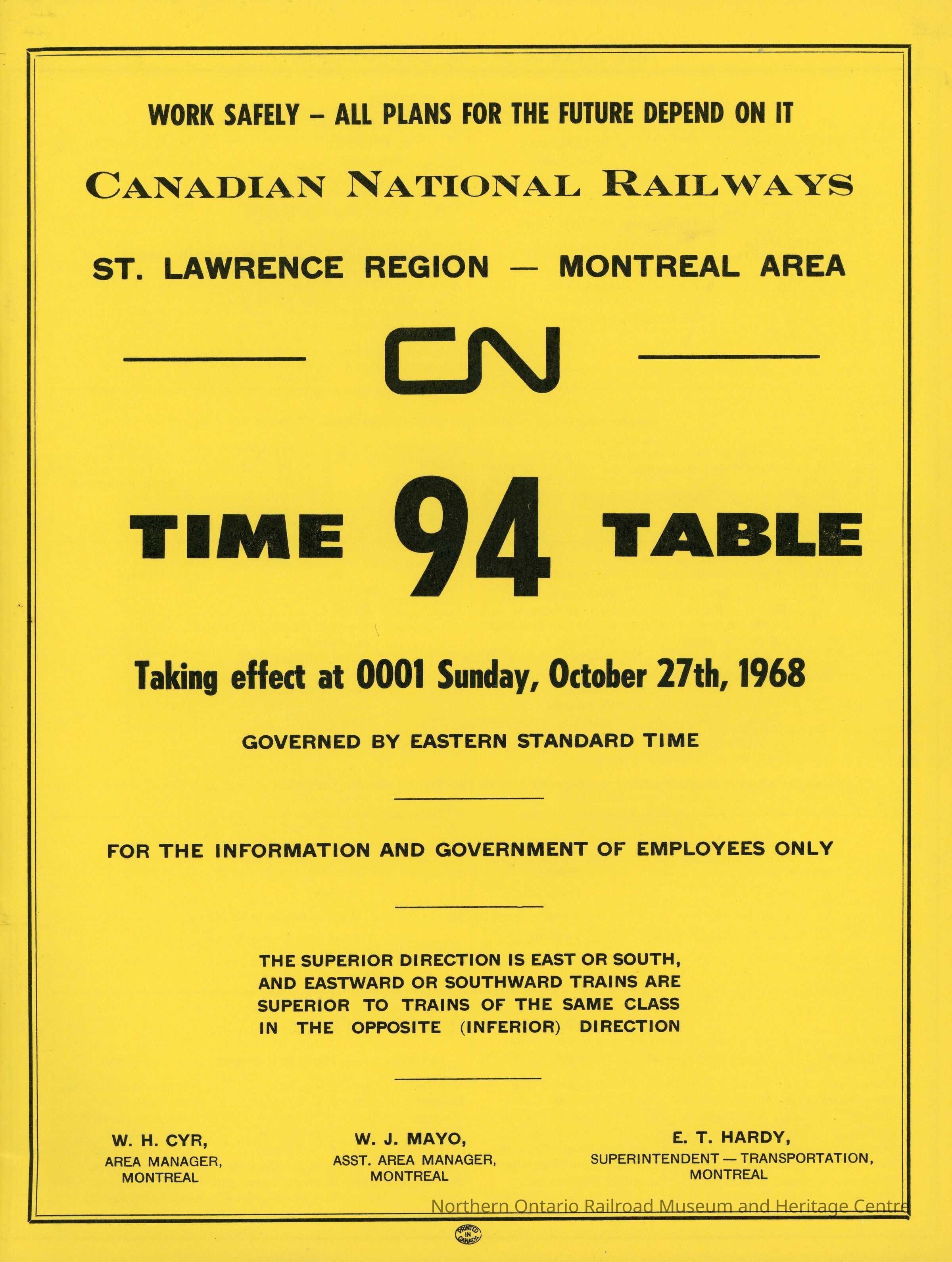 Employee Timetable, CNR, St. Lawrence Region, Montreal Area, Timetable 94, October 27th 1968.Collection