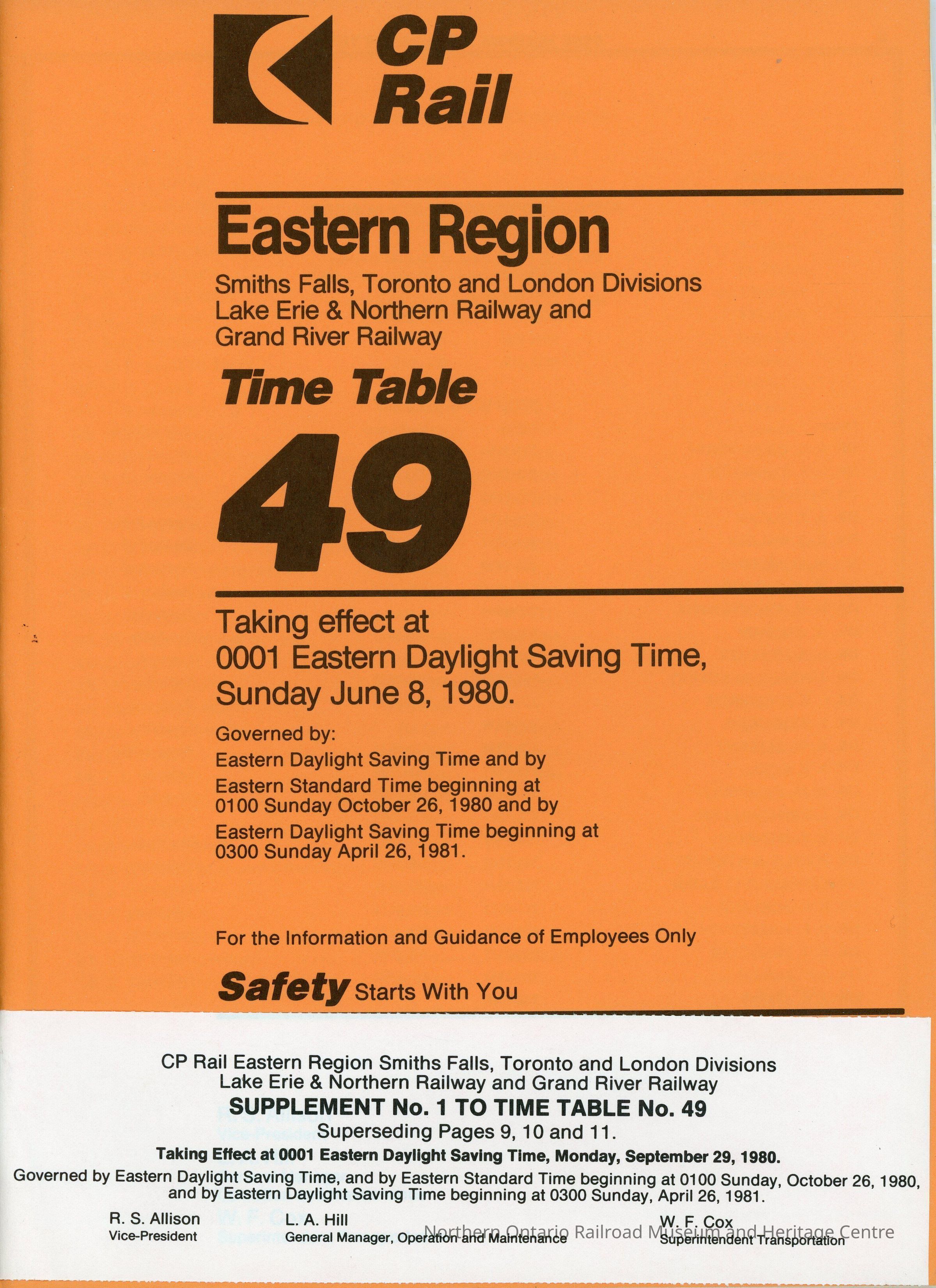 Employee Timetable, CP Rail, Eastern Region, Timetable 49, June 8th 1980.Collection
