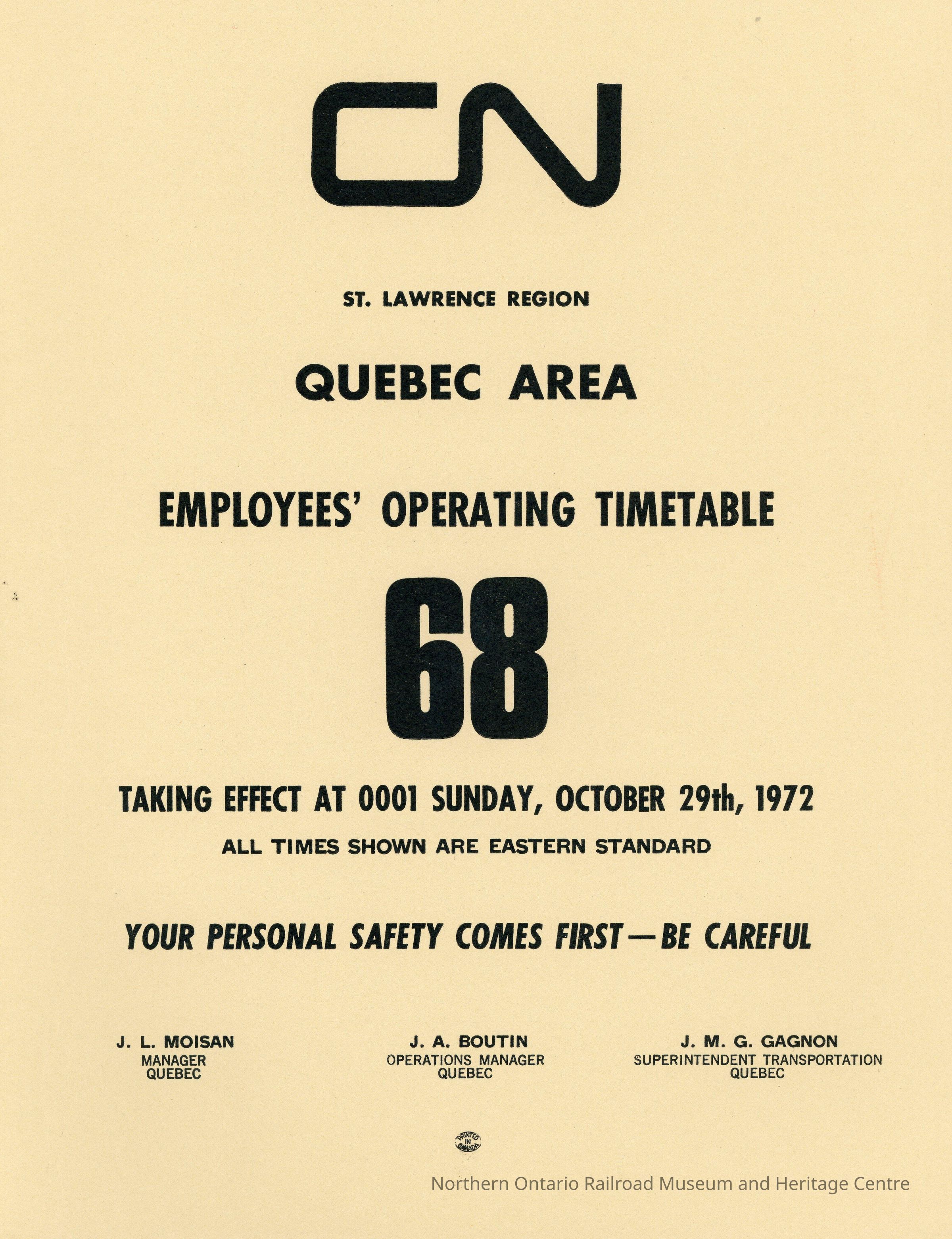Employee Timetable, St. Lawrence, Quebec Area, Timetable 68, October 29th 1972.Collection