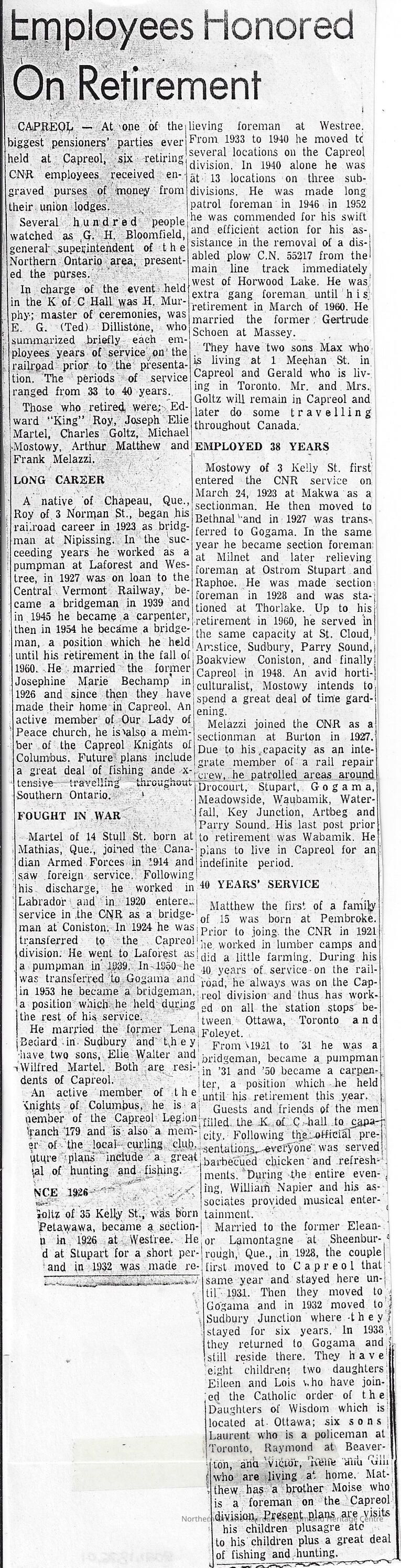 The employees are: Edward Roy (bridgeman), Jospeh Elie Martel(bridgeman), Charles Goltz (long patrol foreman), Michael Mostowy (sectionman), Arthur Matthew (bridgeman, pumpman, carpenter) and Frank Melazzi (article cuts off). The article discusses facts about each worker.