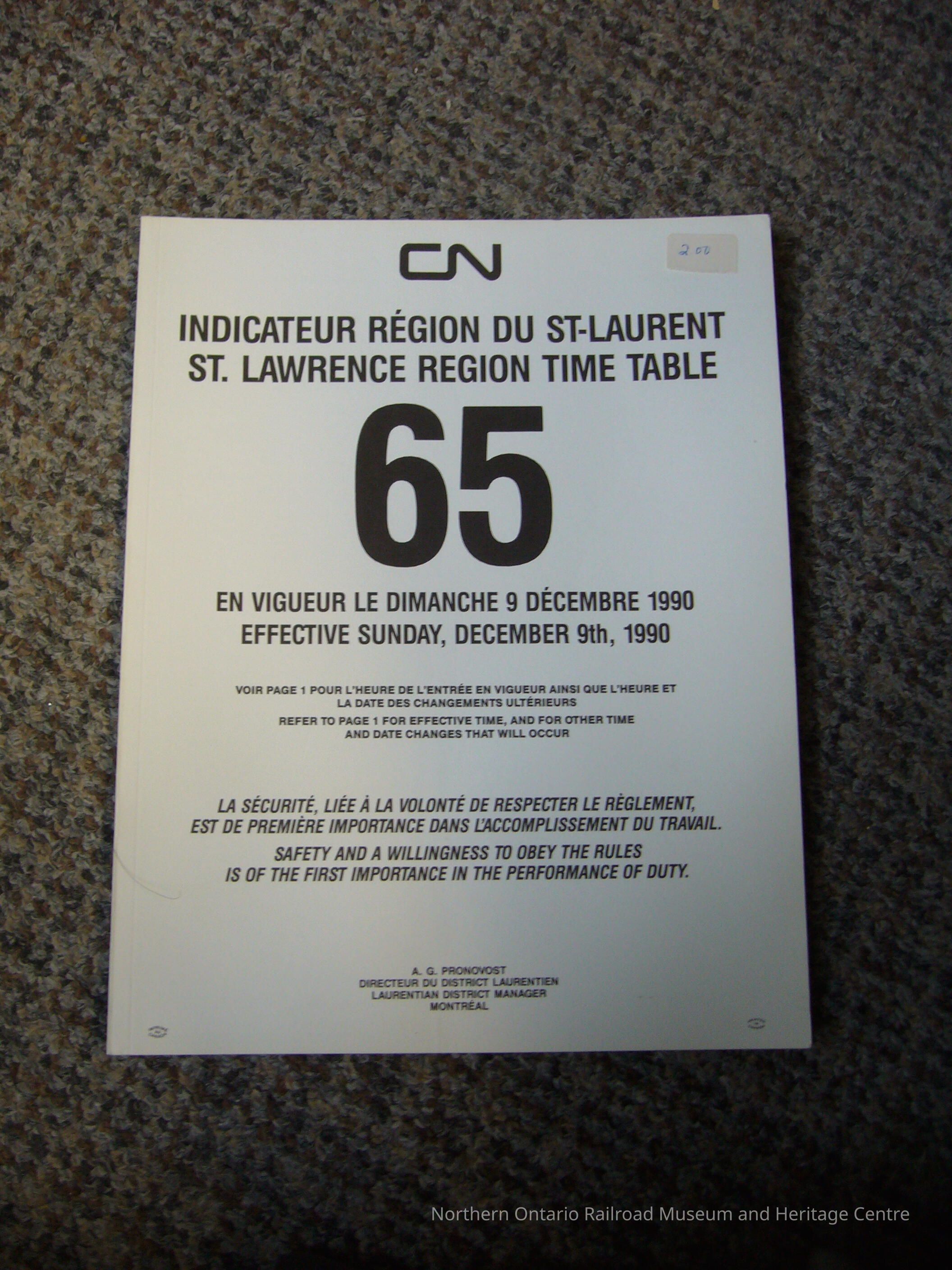 Employees Operating Timetable 65 St. Lawrence Region, December 9th 1990Entry/Object ID