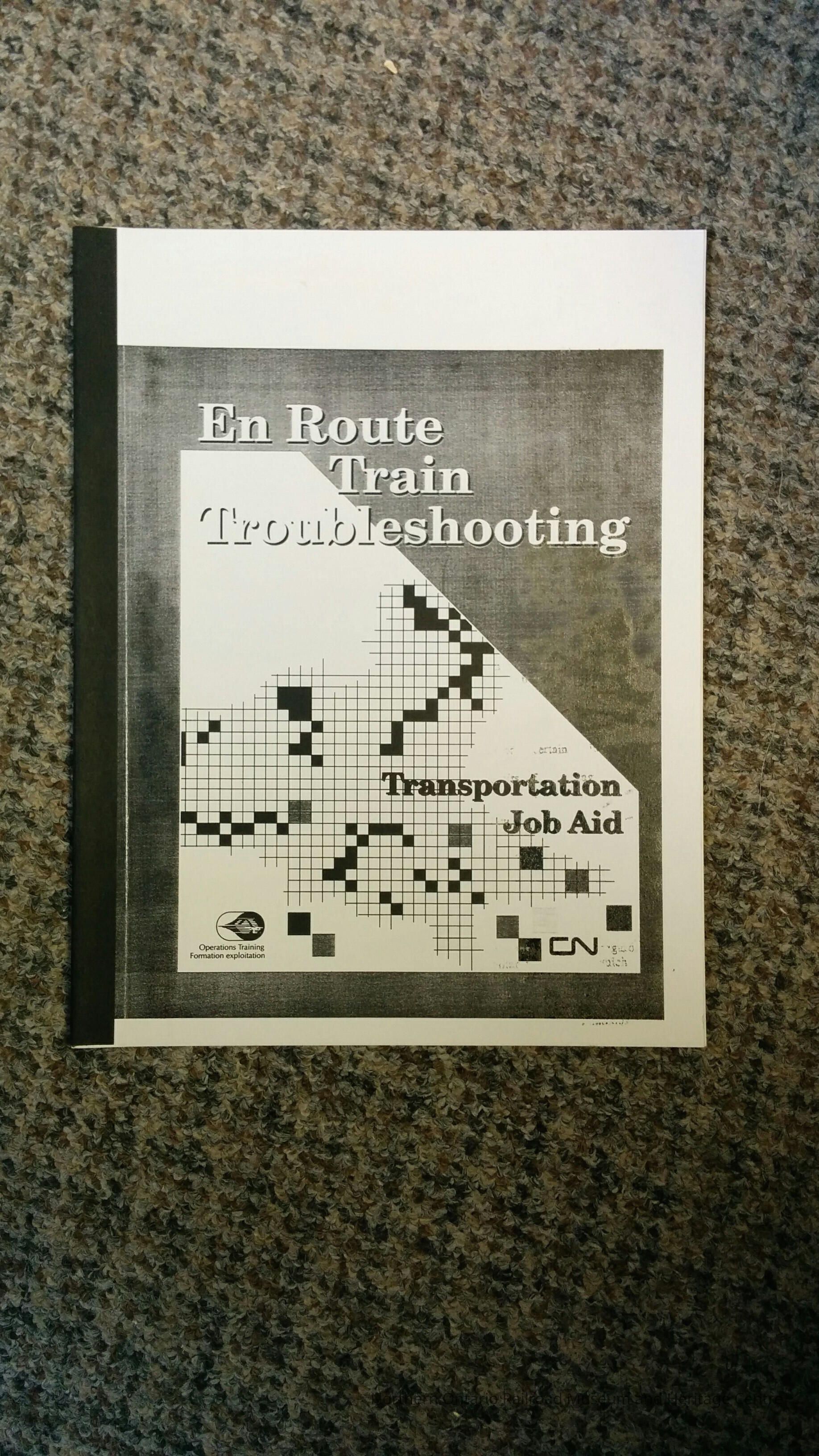 Book, manual for train troubleshooting for Canadian National. Includes: designation of locations, freight car, 6 & 8 wheel trucks, special equipment, foreign 5 paks, potential hazards, overheated bearings, roller bearings, end cap, adapter position, friction/journal bearings, burnt off journal, hot boxes, hot box evolution, sticky or dragging brakes, air brake system, overview, safety, air brake components, retainer valve, combinstion dirt collector and cutout cock, angle cock, air brake hoses, A-1 reduction relay valve, truck mounted air brake equipment, hand brake, when to cut out air brakes, how to cut out air brakes, articulated equipment, wheels, cracked broken or shattered rim, thermal cracks, shelled tread,built up tread, slid flat, wheel plate, dragging or loose equipment, high/low couplers, center plate.