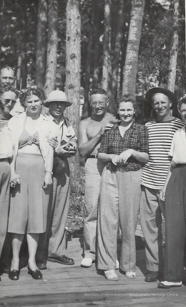 Black and white photograph showing Esther and Harold Prescott and their friends. The photograph was taken in 1948 and appears to have been taken at a camp, cottage, or beach house. The group is standing together on a dock. They are all in summer clothes, one woman is even wearing a bathing suit top. Esther is in a plaid shirt and checkered pants, to her left Harold is standing. Harold is wearing a striped shirt and a wide-brimmed hat.