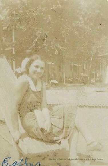 Sepia coloured, faded photograph of Esther Prescott [nee Lawrence]. Esther appears to be sitting on a beach in a lawn chair. Behind her what appears to be a cabin or beach house is visible as well as a dock. She is swearing a sun dress and holding a book.