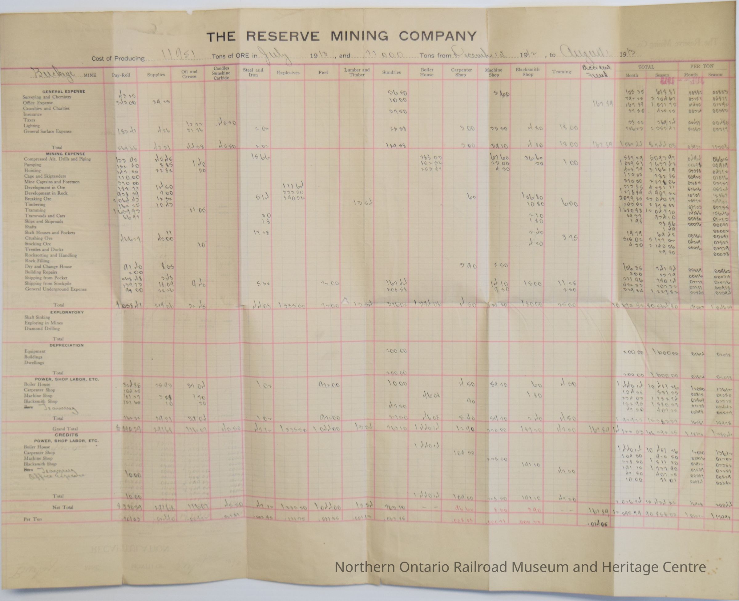 A chart recording the expenses paid by The Reserve Mining Company, at Buckeye Mine, for producing 11951 tons of ore in July 1913 and 11000 tons from December 1st 1912 to August 1st 1913. The columns mark expenses by: pay-roll; supplies; oil and grease; candles sunshine carbide; steel and iron; explosives; fuel; lumber and timber; sundries; boiler house; carpenter shop; machine shop; blacksmith shop; teaming; accident fund; total by month and season; and total per ton. The rows mark general expenses; mining expenses; exploratory expenses; depreciation expenses; power, shop labor, etc.; and credits, power, shop labor, etc. On the reverse of the sheet is a chart recording the "recapitulation" for the month of July 13.Collection