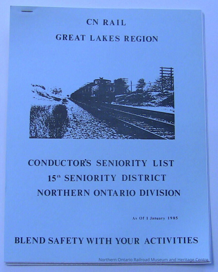 A 1985 seniority list for CN conductors in the 15th Seniority District of the Northern Ontario Division of the Great Lakes Region.Collection