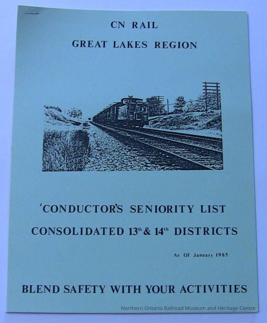 CN Rail Great Lakes Region Conductor's Seniority List, Consolidated 13th and 14th Seniority Districts, Northern Ontario Division, as of January 1985Description