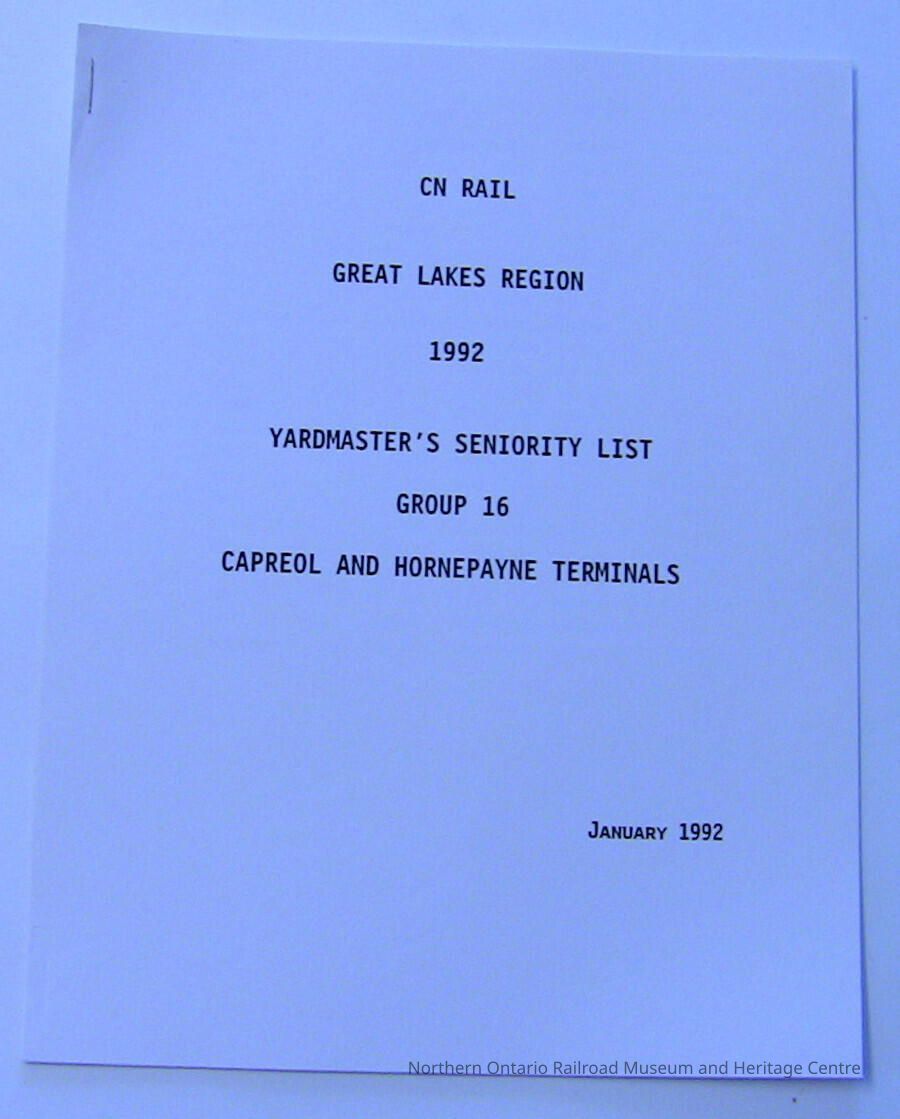 A 1992 seniority list for CN Yardmasters at the Capreol and Hornepayne Terminals.Collection
