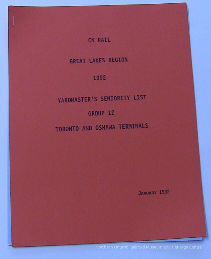 A 1992 seniority list for CN Yardmasters at the Toronto and Oshawa Terminals.Collection