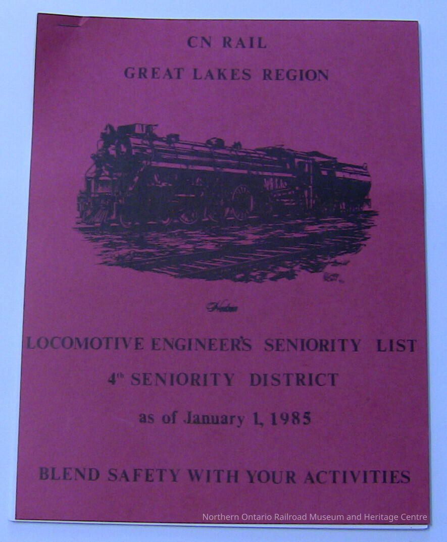 A 1985 seniority list for CN Locomotive Engineers in the 4th Seniority District of the Great Lakes Region.Collection