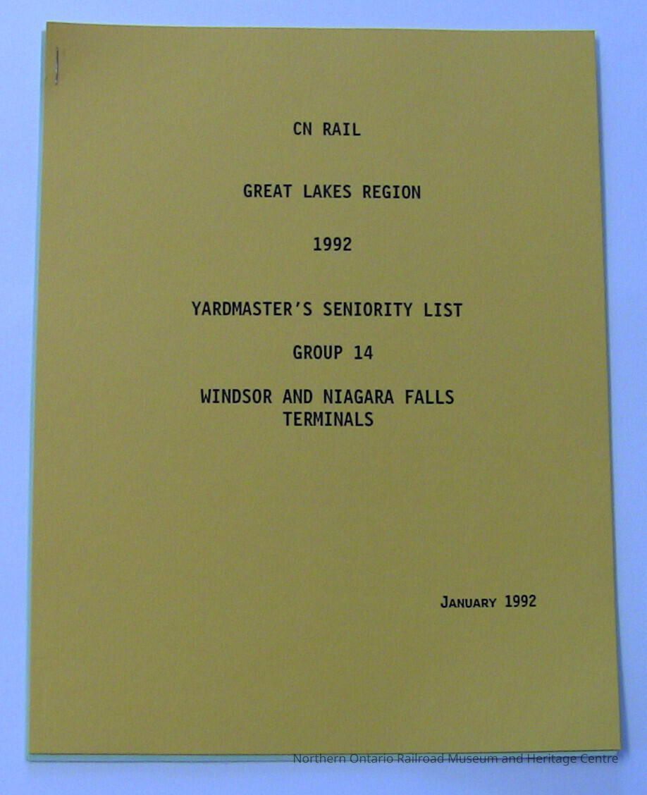 A 1992 seniority list for CN Yardmasters at the Windsor and Niagara Terminals.Collection